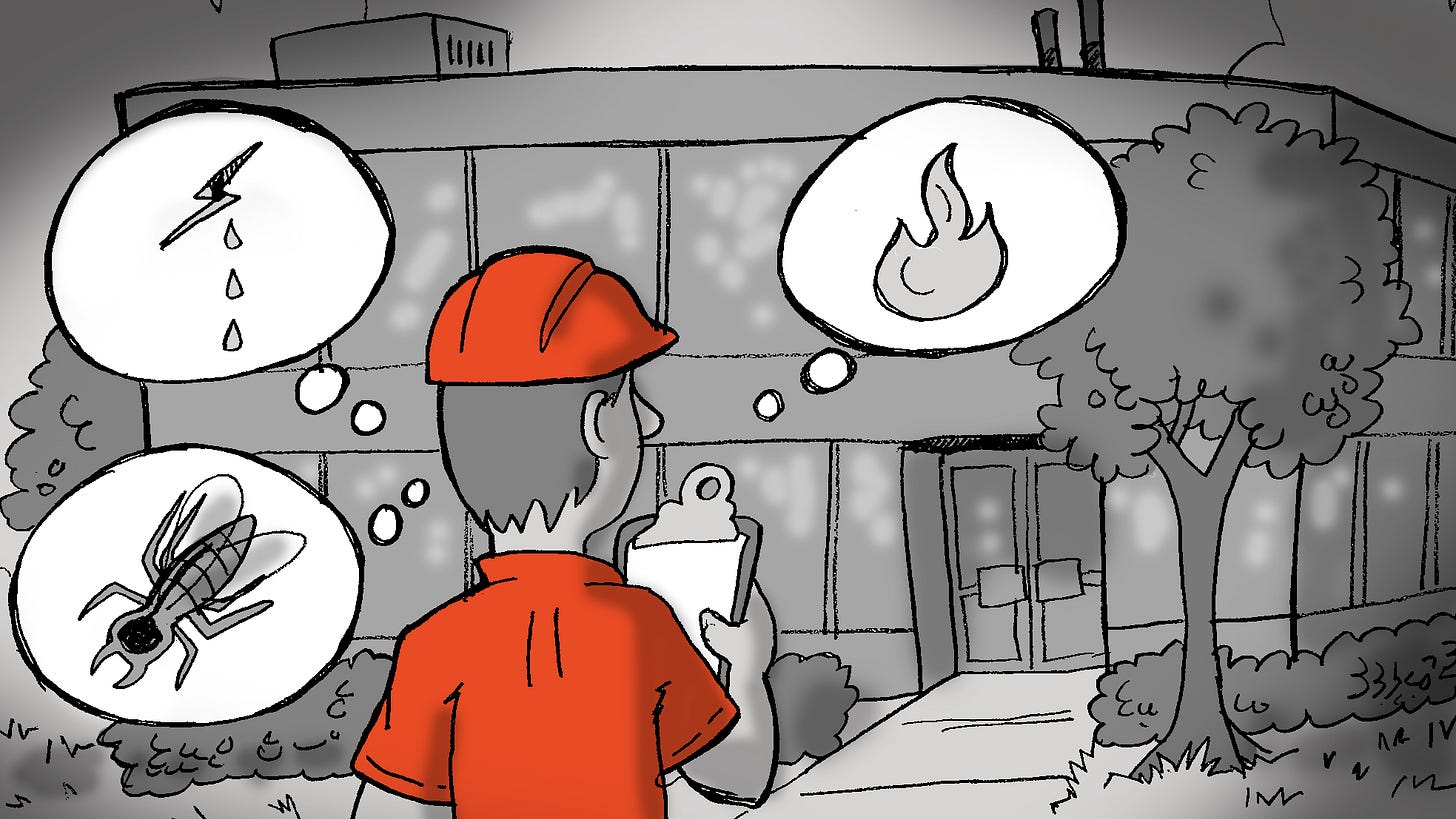 "The people doing an assessment of a building have five senses," Greg says, "and you have to use all five." Greg explains how simply rapping your knuckles on a wall can reveal if there is concrete behind it. Listening to someone walking in high heels can indicate the construction of the subfloor. Finding dots of light above the ceiling means water can get in. You can smell evidence of mold and smoke—if you're attuned to detecting it.